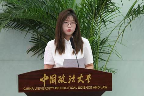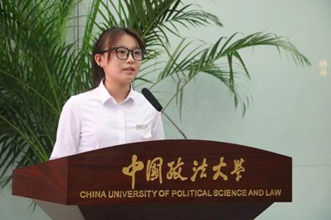 在校生代表、国际商务2102班刘欣欣结合自身经历祝愿新生能在法大商院这样一个全新的平台上,用更加宽阔的眼界,找到自己的人生方向,找到支撑自己前进的动力源泉。