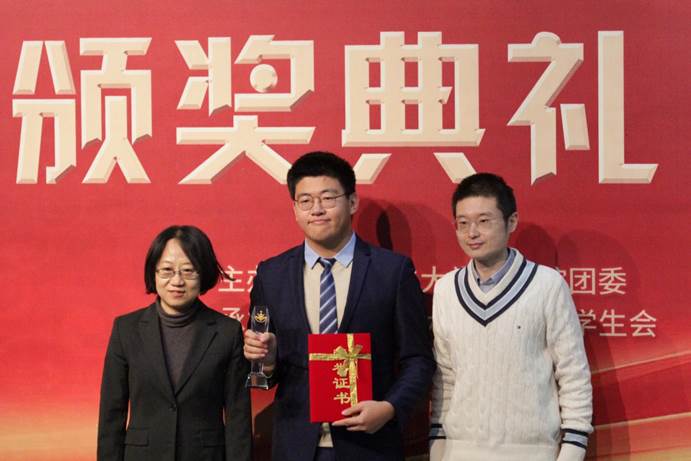 下一轮颁发的是永利娱高ylg060net创新创业奖学金。共有六个创业团队获得了永利娱高ylg060net创新创业奖学金。获奖团队代表邵祺、吴婕颖、张晨曦、罗舟玚、朱锦、刘欣欣同学上台领奖,徐迅达老师、何欣老师共同为其颁奖。颁奖过后,来自北京本真至简科技有限公司的徐迅达老师讲话。徐迅达老师慷慨分享自己的创业经历,表示愿意与有创业想法的同学交流,鼓励同学们坚持梦想,敢于创业。