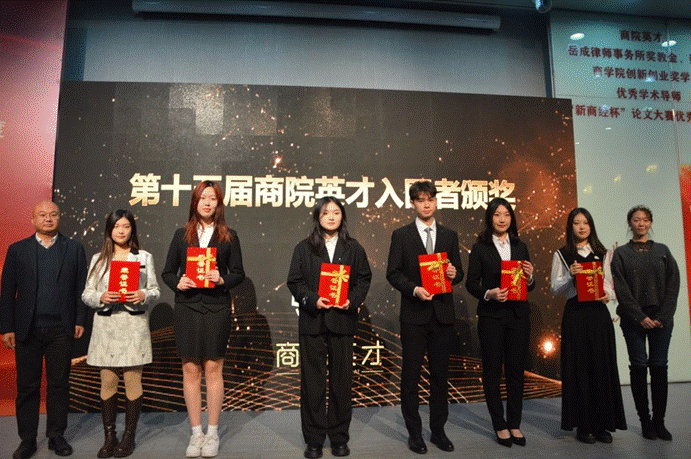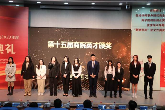 随后第十五届“商院英才”荣誉获得者正式揭晓,他们分别是匡韵逸、傅泽尉、王轶尧、赵佳一和蒲玉。“商院英才”奖项得主们不仅在学业方面表现出色,取得了优异的成绩,而且在科研竞赛中获得了丰硕的成果。此外,在社会实践、社团工作等方面,他们也屡获佳绩,是商院学子们心中当之无愧的英才。