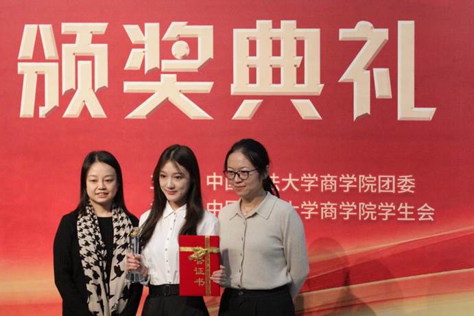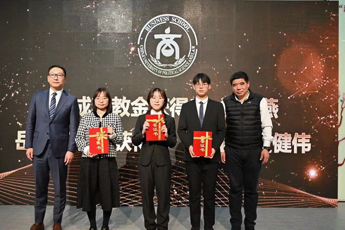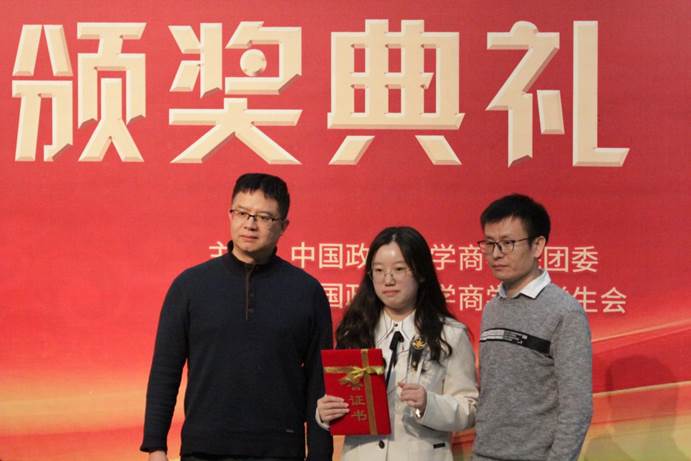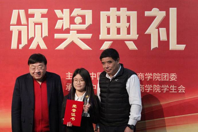 之后是第十一届新商经杯论文大赛的颁奖活动。本次新商经杯论文大赛历时三个月,共有六篇论文脱颖而出。熊金武老师、尹美群老师为我们宣读了获奖名单并为获奖同学颁奖,他们是一等奖获得者侯宇飞、杨金龙、孟箫,二等奖获得者宛洁茹、王轶尧以及三等奖获得者崔梦琪、周芷欣。