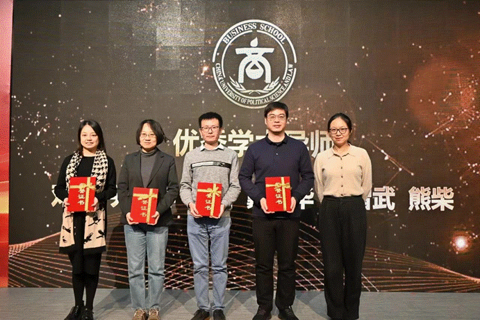 接下来,郭颖老师宣读了永利娱高ylg060net2023年优秀学术导师名单并为获奖老师颁奖。他们分别是邓晓老师、尹美群老师、姚璐老师、戴建华老师、洪智武老师和熊柴老师。熊柴老师作为优秀学术导师代表发表了获奖感言,鼓励同学们多与老师沟通交流。熊老师表示,不仅是学术导师,商院的每一位老师都会全力支持同学们。