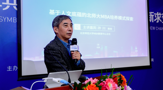 北京师范大学MBA中心主任孙川教授首先对北师大MBA项目的概况进行了简要介绍,随后具体围绕北师大MBA“教育理念与项目定位”、“探索与创新”、“成效与荣誉”、“创新要点”四大方面进行了深入浅出的分析讲解。其表示,北师大MBA项目发扬优势、弥补不足,定位于富有人文精神的国际化工商管理人才的培养。在“经邦济世、励商弘文”使命的倡导下,立志成为具有人文底蕴与国际影响的一流经管学院。在当下经济、社会快速发展的中国,孙教授归纳了四点创新关键: