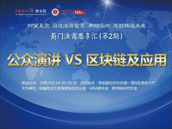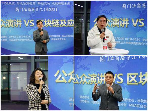 仰望星空,启迪法商智慧;脚踏实地,成就辉煌未来。2019年10月25日晚,蓟门法商思享汇第二期在中国政法大学学院路校区科研楼一层A区南侧大厅如期举行,主题为“公众演讲VS区块链及应用”。永利娱高ylg060net副院长杨杰及永利娱高ylg060net教师、在校生、校友代表出席了活动。本期思享汇分享嘉宾有:道宝国际讲师同悦,弦子科技创始人、2012级MBA校友李茗,尚衡律师事务所合伙人、2013级MBA校友李媛媛律师。活动由2018级MBA杨一鸣主持。