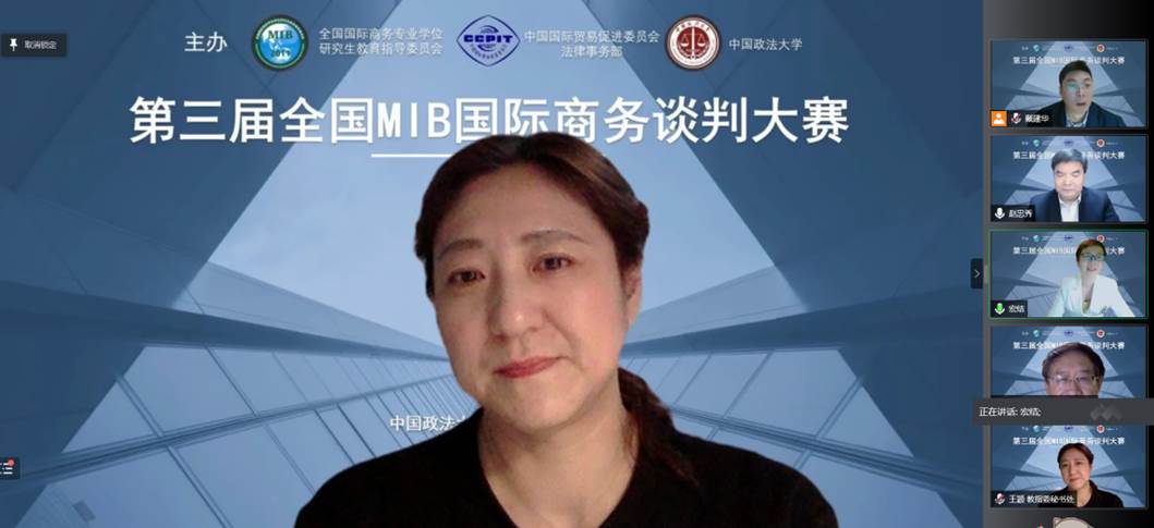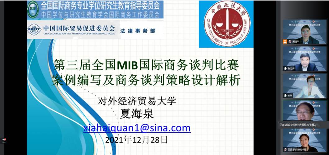 2021年12月28日晚19:30第三届全国MIB国际商务谈判大赛启动仪式暨参赛者培训讲座在线上正式召开。本次启动仪式由永利娱高ylg060net宏结教授主持,全国国际商务专业学位研究生教育指导委员会委员兼秘书长、山东财经大学校长赵忠秀教授启动第三届全国MIB国际商务谈判大赛;全国国际商务专业学位研究生教育指导委员会秘书处办公室主任、对外经济贸易大学国家对外开放研究院常务副院长王颖研究员受邀致辞,对外经济贸易大学继续教育与远程教育学院院务委员会主席、国际商务专业委员会会长、国际商务谈判教育资深专家夏海泉教授应邀,线上为来自全国各大高校的指导教师和参赛学生共计420余人次进行了赛前培训讲座。
