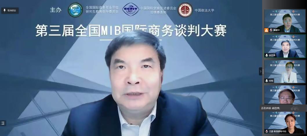 会议第一项是由赵忠秀教授代表国际商务教指委对前两届大赛工作进行总结。赵忠秀教授首先回顾了国际商务专业学位教育10年的发展历程,指出国际商务谈判是国际商务人才培养中的核心课程之一,以赛促学、促教、促建可以推动人才培养质量的提高。大赛肩负着在新发展格局下为党育人、为国育才的人才培养使命。回顾前两届大赛的举办模式,赵校长高度肯定了由全国国际商务专业学位研究生教育指导委员会、中国贸易促进委员会法律事务部、中国政法大学三个主办单位共同开创的产学研人才培养模式的探索,对作为主要承办方的永利娱高ylg060net国际商务团队表示了感谢。展望新一届的比赛,赵校长鼓励更多学校可以积极参与,推动赛事持续健康地成长,更加有力地促进学生成长。最后,赵校长宣布第三届全国MIB国际商务谈判大赛正式启动。