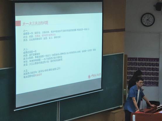 此外,王晓曦老师重点介绍了外校交流、学业预警以及奖惩制度,包括校长奖学金、学业奖学金、三好学生和优秀学生干部的评价标准等,并向新生们说明了一些违纪处罚制度,让新生们对学校的制度有了一定了解。