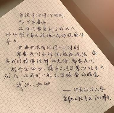 同时,为了表达自己对疫情的殷殷关切,各班同学们纷纷将情感注入笔杆,通过手写祝福语或作画来为武汉加油鼓劲:金融1901班的叶晨蔚同学画下一朵正在热烈绽放的花,预示着温暖的春天终将驱赶疫情;工商管理1901班的高畅同学写下“读圣贤书,有三不能避:为民请命,为国赴难,临危受命”,讴歌白衣天使的勇敢与伟大精神……同学们虽身处各地,心却连在一起,共同祈祷这场疫情尽快结束。