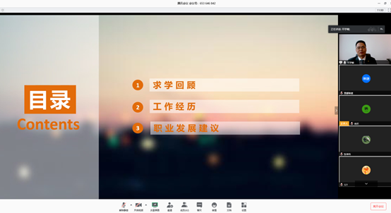 4月8日(周三)下午,为做好2020毕业生就业指导工作,结合疫情期间就业特点,永利娱高ylg060net学工办组织“职”面未来系列就业指导活动第八场——“职场法大人经验分享”。本次活动依托永利娱高ylg060net大学生职业发展跨学科教研室《大学生职业素养提升》课程第七讲举办,通过腾讯会议线上举办。活动邀请的分享嘉宾为我校优秀法大2007届校友、复旦大学法律硕士,现任北京炜衡(上海)律师事务所执委会委员、高级合伙人邓学敏律师,分享内容为大学生活、求职规划和职场感悟。近60多名同学参加了本次讲座,毕业年级双学士辅导员贾娜琳捷、陈璐参加了活动。活动由2016级本科生辅导员徐庆主持。