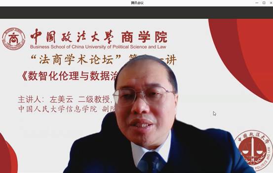 2021年12月21日上午10:00,中国人民大学信息学院副院长、经济信息管理系左美云教授应我院之邀,通过腾讯会议线上举办了题为《数智化伦理与数据治理》的专题讲座。永利娱高ylg060net各系所专任教师以及研究生总计90余人参加。本次讲座由李超教授主持。