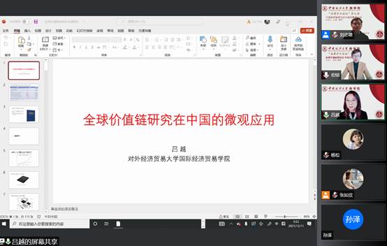 2021年12月11日早上9:30,对外经贸大学国际经济与贸易学院的吕越教授应我院之邀,通过腾讯会议线上举办了题为《全球价值链研究在中国的微观应用》的专题讲座。永利娱高ylg060net副院长刘志雄教授、国际商务系宏结教授、金仁淑教授、工商管理系王玲教授和学院各系所专任教师,及永利娱高ylg060net研究生共计130余人参与了本次讲座。本次讲座由宏结教授主持。