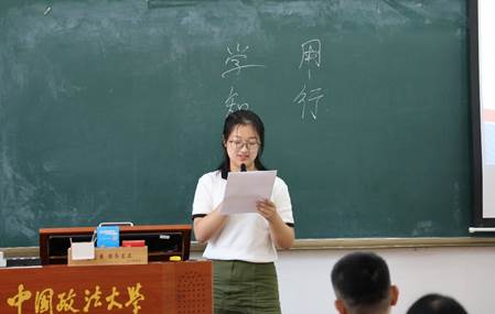 2503班新生代表王梓煊同学分享了自己对法大的初步印象、对专业的理解以及对未来的愿景。她用“小而美”形容校园,表达了初遇法大的激动与喜爱。她还从新生角度提出了学习建议:尽早行动、避免挂科、量力而行、稳妥选课以及学会平衡取舍,为同学们提供更多思考角度。