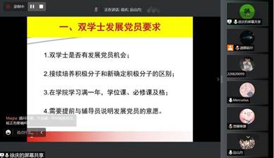在辅导员贾老师和吴老师为同学们介绍过永利娱高ylg060net基本概况和疫情防控纪律之后,教学科研办冯老师为同学们讲解了永利娱高ylg060net第二学士学位的培养方案及课程、考务安排,就业中心孙老师为大家介绍了相关的就业政策和需要履行的相关手续。两位老师的介绍对于同学们接下来两年的学业和就业安排有着重要的意义。在这之后,党务办公室主任徐老师为大家介绍了双学士党员发展、党员教育管理和党组织关系转接等内容。这对同学们接下来的个人规划和自身发展有着指导作用。