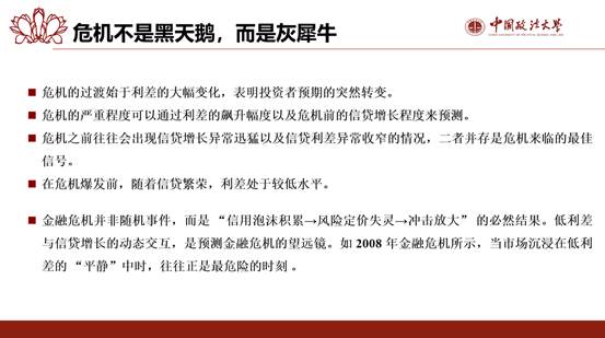 赵莹莹同学指出,金融危机并非随机事件,而是遵循“从信用泡沫积累→风险定价失灵→冲击放大”的过程。危机的过渡阶段起始于利差的大幅变化,这一变化体现了投资者预期的突然转变。并且,危机的严重程度可依据利差飙升幅度以及危机前信贷增长程度来预测。