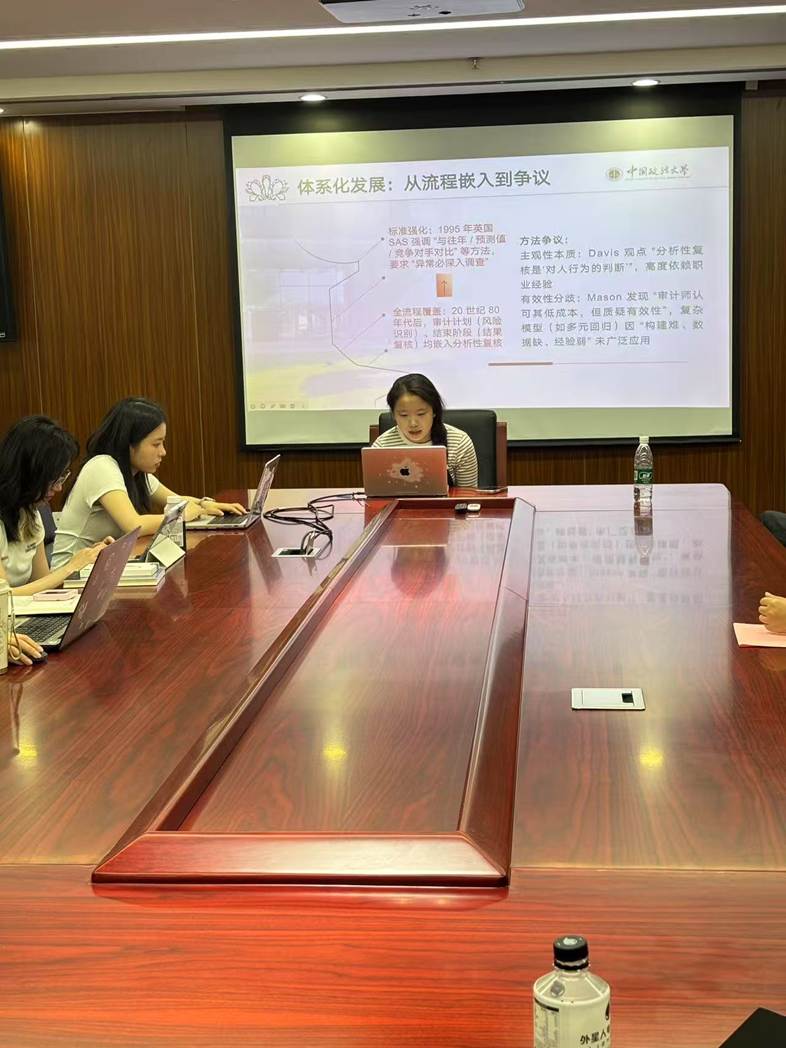研讨会上,财务会计系研究生黄秋汛、钱益竹、方舒仪、姚佳欣分别就《审计简史》不同章节进行汇报。黄秋汛梳理前三章内容,从古代美索不达米亚和埃及的简单账目核查讲起,揭示审计作为经济监督手段与人类文明同步发展的本质;钱益竹聚焦第四至五章,解析测试与抽样及内部控制审计;方舒仪通过第六至七章内容,探讨工业革命催生现代股份制公司后,审计因所有权与经营权分离而走向独立化、法定化的过程;姚佳欣则围绕最后几章,分析20世纪审计飞速发展及全球化背景下审计面临的挑战与机遇,展现审计在经济、社会和法律背景中的动态演变。汇报过程中,主讲人结合书中内容,提炼审计发展关键节点,为后续讨论奠定基础,让参会师生对审计从起源到现代的演进逻辑有了清晰认知。