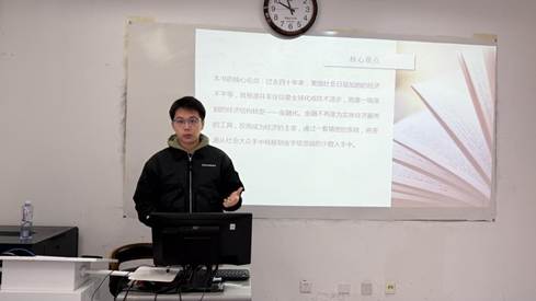 点评人陈佳蔚同学认为杨济玮同学的汇报以制度变迁为核心,从金融化作为资本主义的制度安排,到新技术时代的不平等风险,层层递进地展开分析,整合了众多学者的理论,视野开阔,对金融化加剧不平等的多维度剖析较为透彻。
