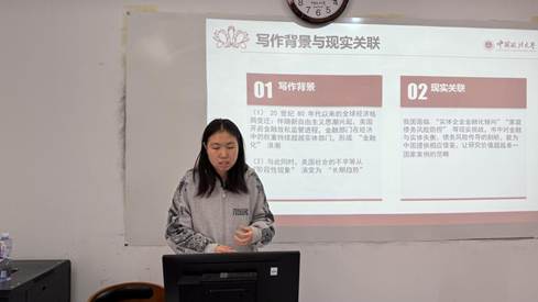 张朝琪同学以“论金融化如何加剧社会不平等:机制、根源与启示”为题详细说明了金融化通过租金抽取、劳资关系重构与风险向家庭转移三种机制,将财富从中低收入群体转移至资本所有者。其汇报结合中国实际提出,金融深化过程中必须坚持服务实体经济的根本宗旨,通过完善社会安全网与优化制度设计,防范分化风险,确保发展成果更具包容性与共享性。