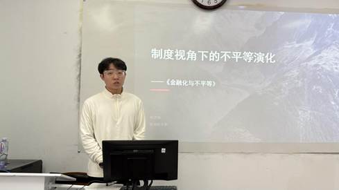 杨济玮同学以“制度视角下不平等演化”为题,阐明不平等是既得利益群体通过垄断核心生产资料、构建并维持“榨取性制度”的政治结果。其通过剖析从原始社会到封建社会的制度垄断逻辑,揭示了金融化如何通过重构金融中介、企业治理与风险分担规则,系统性地加剧了信息、权力与经济的三重不平等,强调在技术时代唯有实现制度制定权的平等,方能从根本上应对不平等挑战。