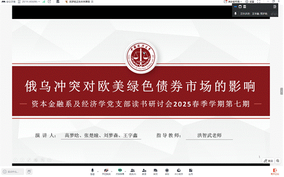 在6月30日举行的专题读书会上,永利娱高ylg060net金融专硕的四位同学:高梦晗、张楚瞳、刘梦森、王宇鑫汇报了文献《地缘政治危机与绿色债券市场:俄乌冲突对欧洲和美国绿色债券市场的影响》。汇报从以下几个方面展开: