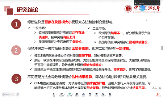 最后,王宇鑫系统梳理了文章的研究结论、政策建议、现存局限及未来方向。研究结论方面,首先明确绿债溢价的存在与规模受研究方法和控制变量影响,欧美市场对俄乌冲突反应不同;其次指出冲突对一级市场绿债溢价无显著影响,但对二级市场存在作用,欧洲因能源危机导致绿债供需变化,与美国市场表现分化;此外,不同匹配方法会造成溢价估计结果差异,因此在研究中需谨慎选择方法。基于上述结论,文章作者提出了三点针对性的政策建议:一是加强市场监管与信息披露,参考国际绿债原则,减少“漂绿”行为,增强投资者信任;二是支持绿债市场流动性,通过建立专门交易平台、减免手续费等改善二级市场流动性不足问题;三是欧洲需平衡能源转型与市场稳定,借助补贴和税收优惠吸引投资者,保障能源转型项目融资。