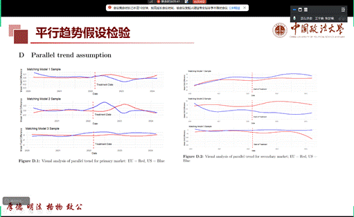 张楚瞳重点讨论了关于欧洲绿色债券的数据处理和模型的平行趋势检验。研究先通过对初始数据的预处理,计算缺失的到期收益率(YTM)、补充最差收益率(YTW)、计算相对买卖价差和构建信用风险变量,使数据更具可比性,这些预处理步骤为后续的匹配模型提供了高质量的变量。论文将预处理后的数据通过三种模式进行分析:CEM不包括发行人评级模型、CEM包括发行人评级模型与PSM,这三种匹配方法分别产生了独立且严格的可比绿色债券与传统债券样本,便于在模型中相互检验,为后续分析奠定了基础。在平行趋势假设检验方面,文章作者验证了一级市场和二级市场中,若无冲突事件,欧洲和美国绿色债券的绿色溢价变动趋势是否同步。通过检验,平行趋势假设成立,支持后续使用双重差分法(DiD)评估冲突对欧洲绿色债券的绿色溢价影响。这些在进行DiD检验前的数据处理和模型检验,为解释俄乌冲突对欧洲绿色债券市场的影响提供了重要数据支撑。
