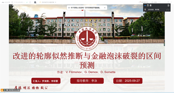 2025年9月27日下午,永利娱高ylg060net资本金融系2025年秋季学期第二期读书会成功举办。李泳老师以及2025级资本金融系的全体同学参与了本次读书会。本期读书会围绕李泳老师推荐的论文《修正轮廓似然推断与金融泡沫爆发的区间预测》(Modified profile likelihood inference and interval forecast of the burst of financial bubbles)展开深入研讨,2025级金融专硕李妍霏和罗润茜两位同学分别进行主题报告,并就论文中的方法与应用提出思考,李泳老师在最后进行了精彩点评。