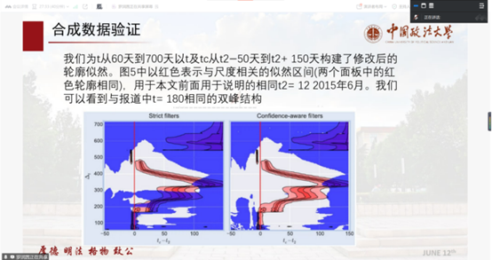 罗润茜同学随后聚焦于论文的方法论创新。她指出,传统LPPLS校准依赖普通最小二乘法,仅提供参数的点估计,存在较大不确定性。本文引入修正轮廓似然方法,通过有效处理“讨厌参数”的干扰,构建更为平滑的似然曲面,从而实现对临界时间的区间估计而非单点预测。罗润茜还结合论文中的合成数据与实证案例(如2015年中国股市泡沫),展示了该方法在多时间尺度分析中的稳健性与预警能力。